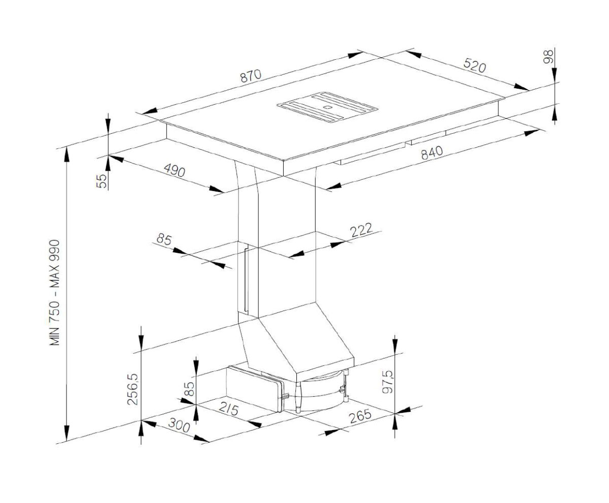 RECTA 87 B4 Slim hat ein ultraschmales Profil von nur 10 cm. Der bodenseitig positionierte Brushless-Motor gewährleistet eine kraftvolle, aber leise Absaugung. Der große Absaugbereich ist mit einem innovativen Wellen-Fettfilter ausgestattet, der die Oberfläche zur Dampferfassung vergrößert. Der praktische Flüssigkeitsauffangbehälter ist für einfache und schnelle Wartung konzipiert.