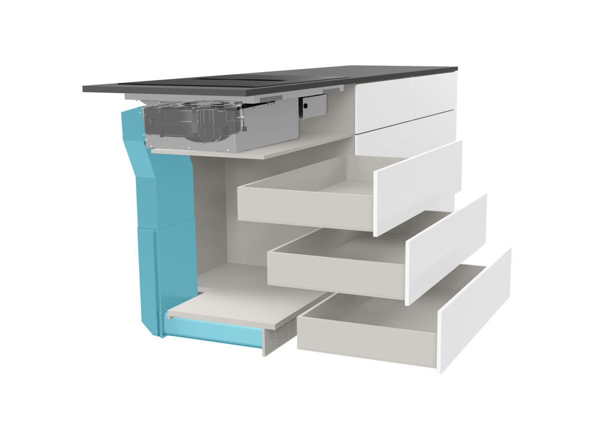 SMART 87 B2 repräsentiert die ultimative Integration von Kochen und Absaugung, mit 4 Induktionszonen mit „Double-Bridge“-Funktion und einem Brushless-Motor, ausgestattet mit einem doppelten V-Fettfilter mit Flüssigkeitsauffang, einfach zu entnehmen und zu reinigen. Auch als Filterversion erhältlich.