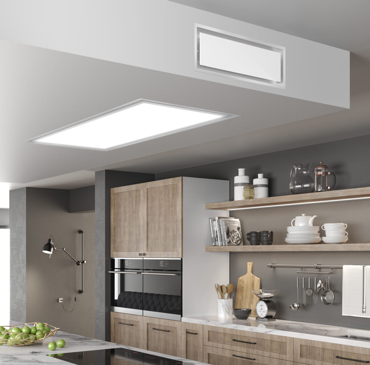 SOLARIS is the ceiling hood with a high-efficiency LED panel. Automatic system for adjusting light intensity and color temperature. Perimeter suction with a Brushless motor and an innovative system that allows the use of the filtering version even for those products integrated into the false ceiling.