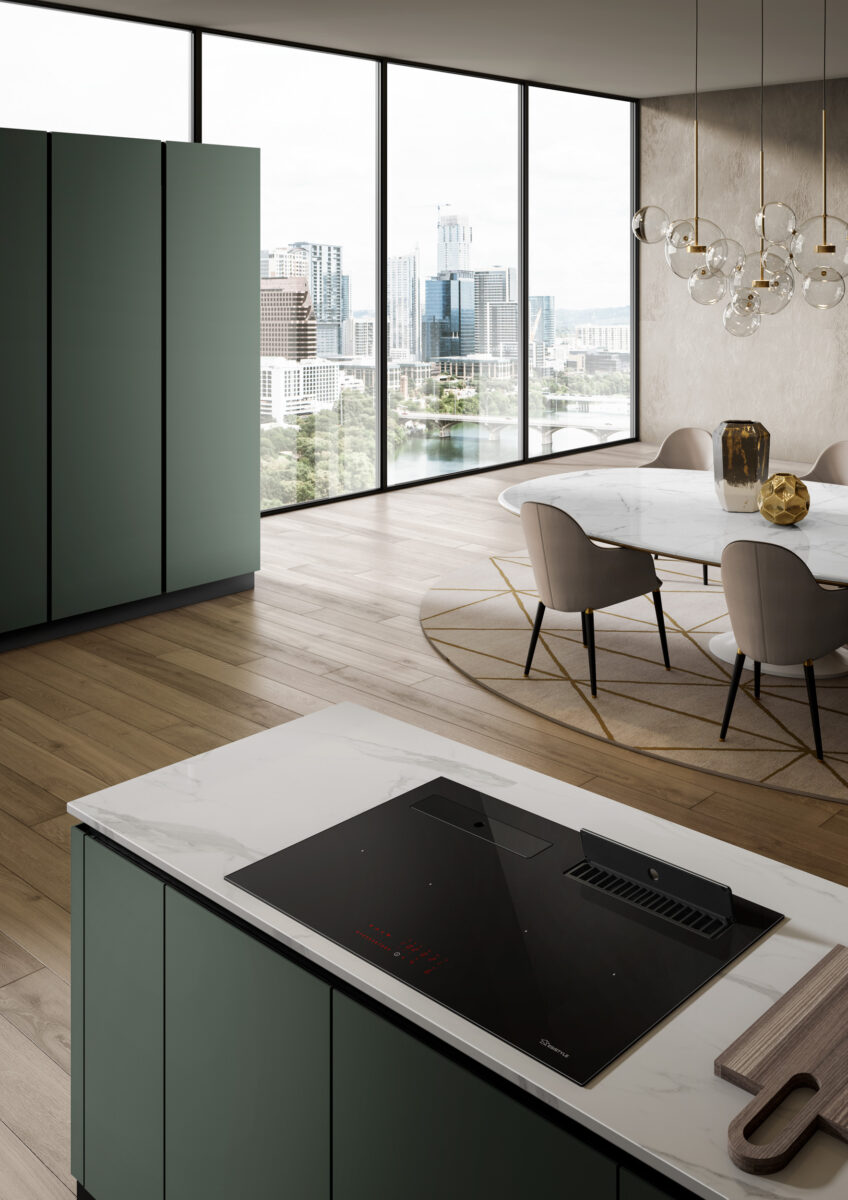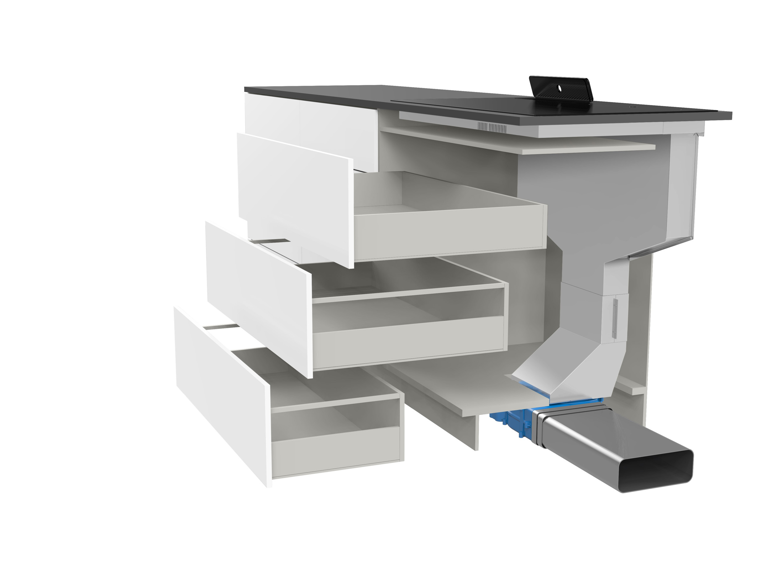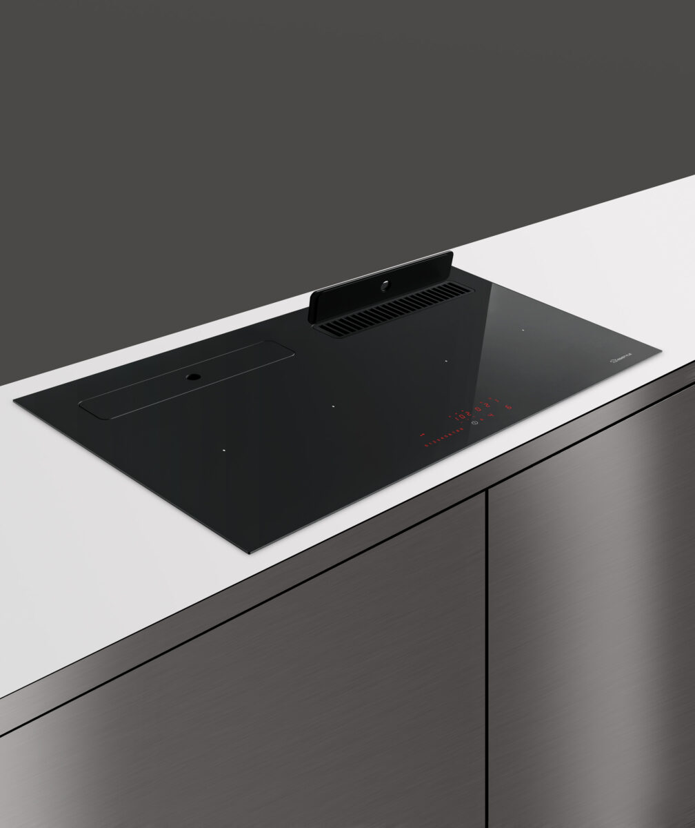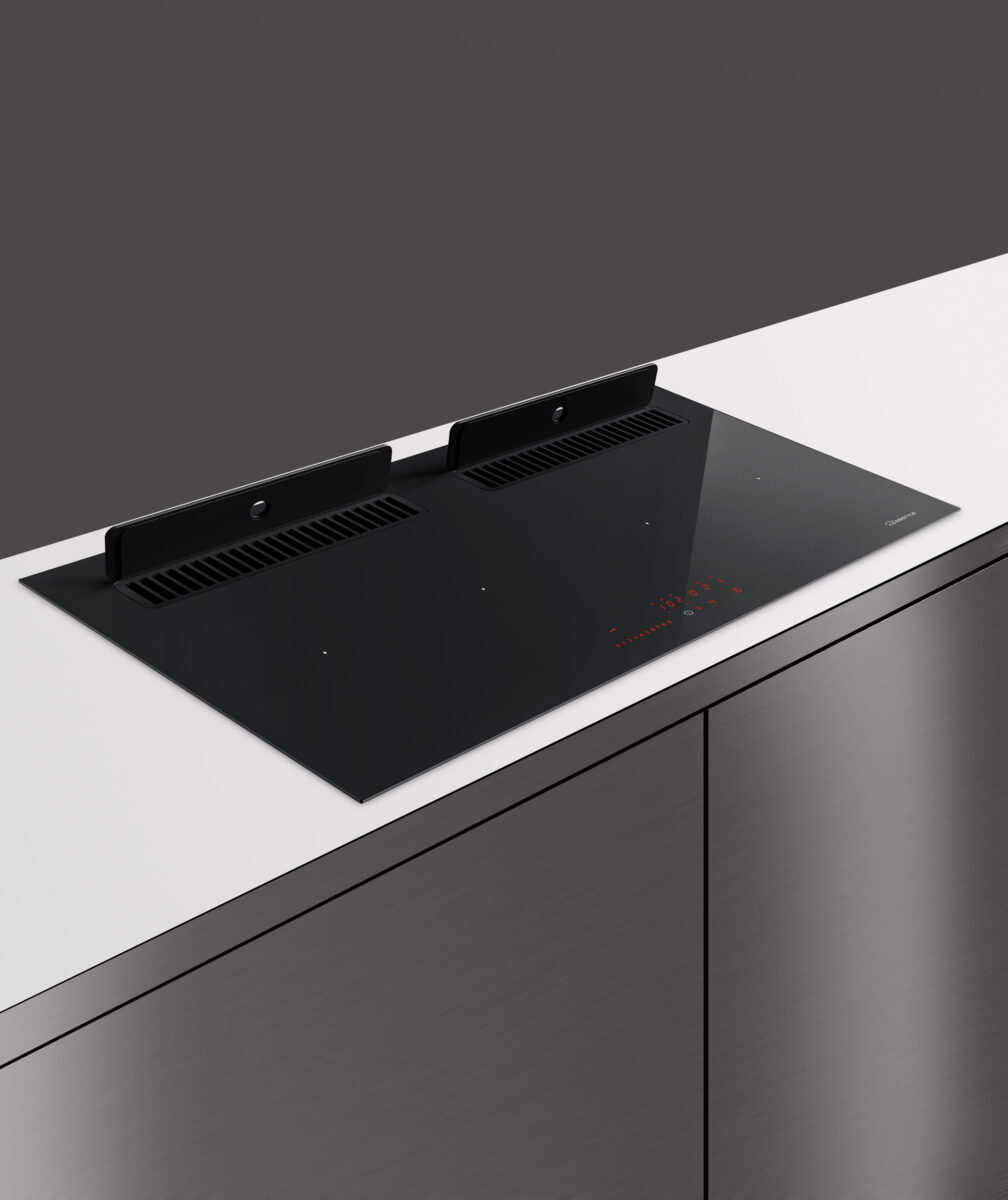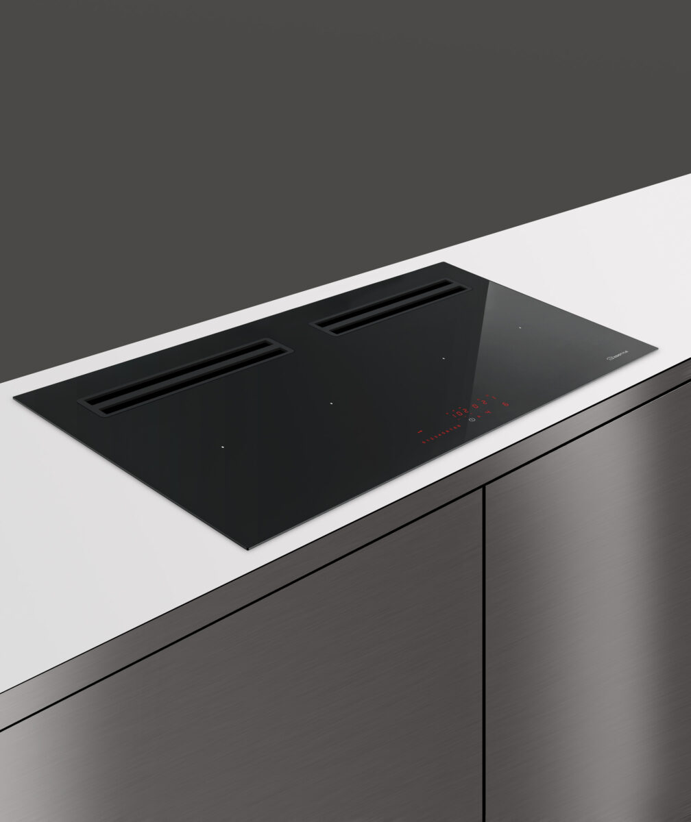 PRATIKO tiene 4 puntos de cocción alineados y 2 zonas Bridge, con los dos extractores traseros utilizables independientemente para aspirar a lo largo de toda la superficie o donde sea necesario. Un sistema de filtros baffle con depósitos recolectores permite captar la condensación y líquidos derramados accidentalmente.