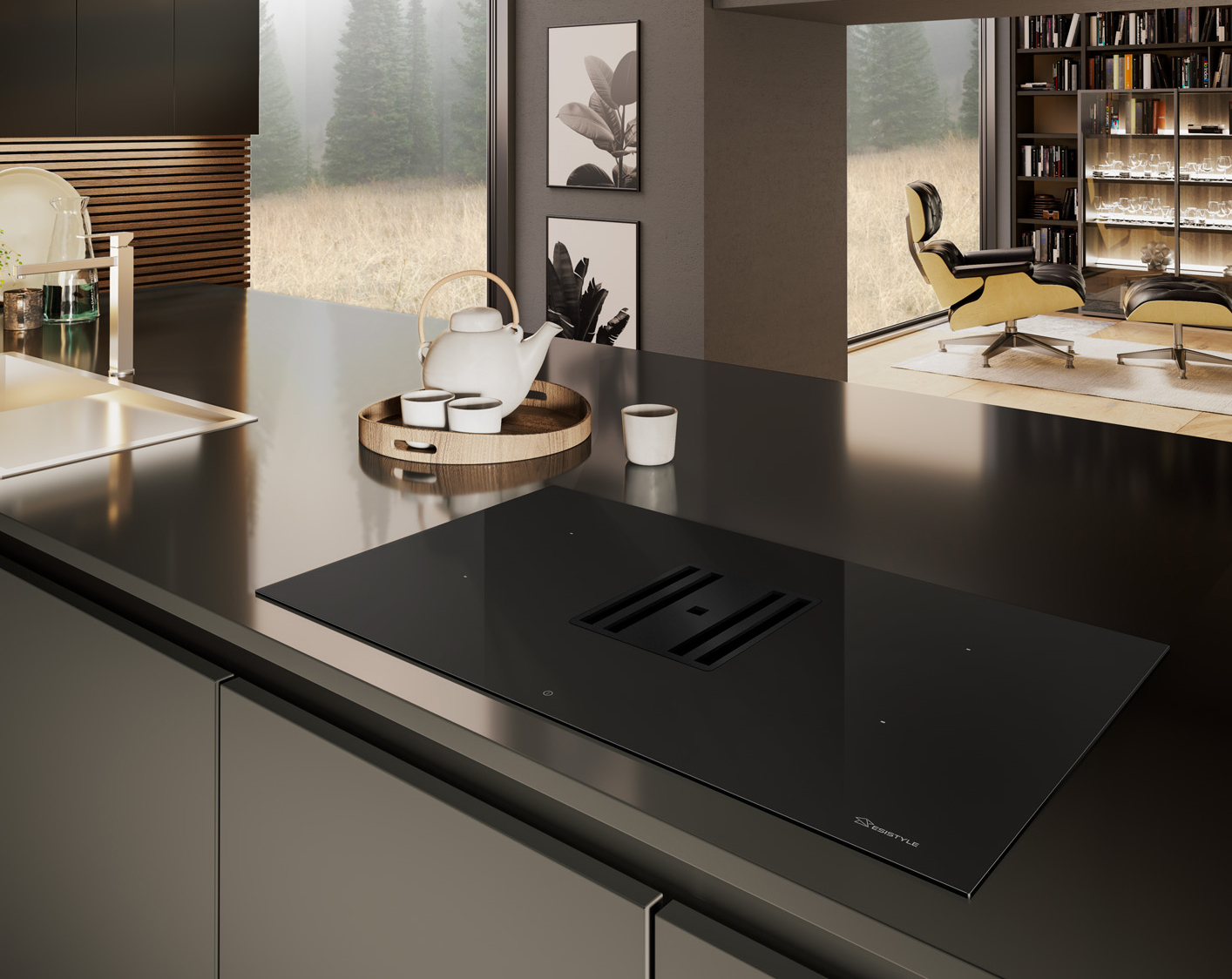RECTA 87 B4 è un piano cottura aspirante innovativo. Ampia area di aspirazione composta da 4 pareti di filtri antigrasso e cestino raccogli liquidi integrato. 4 zone cottura, incluse 2 configurabili a Bridge, e griglia estetica personalizzabile per stile su misura.