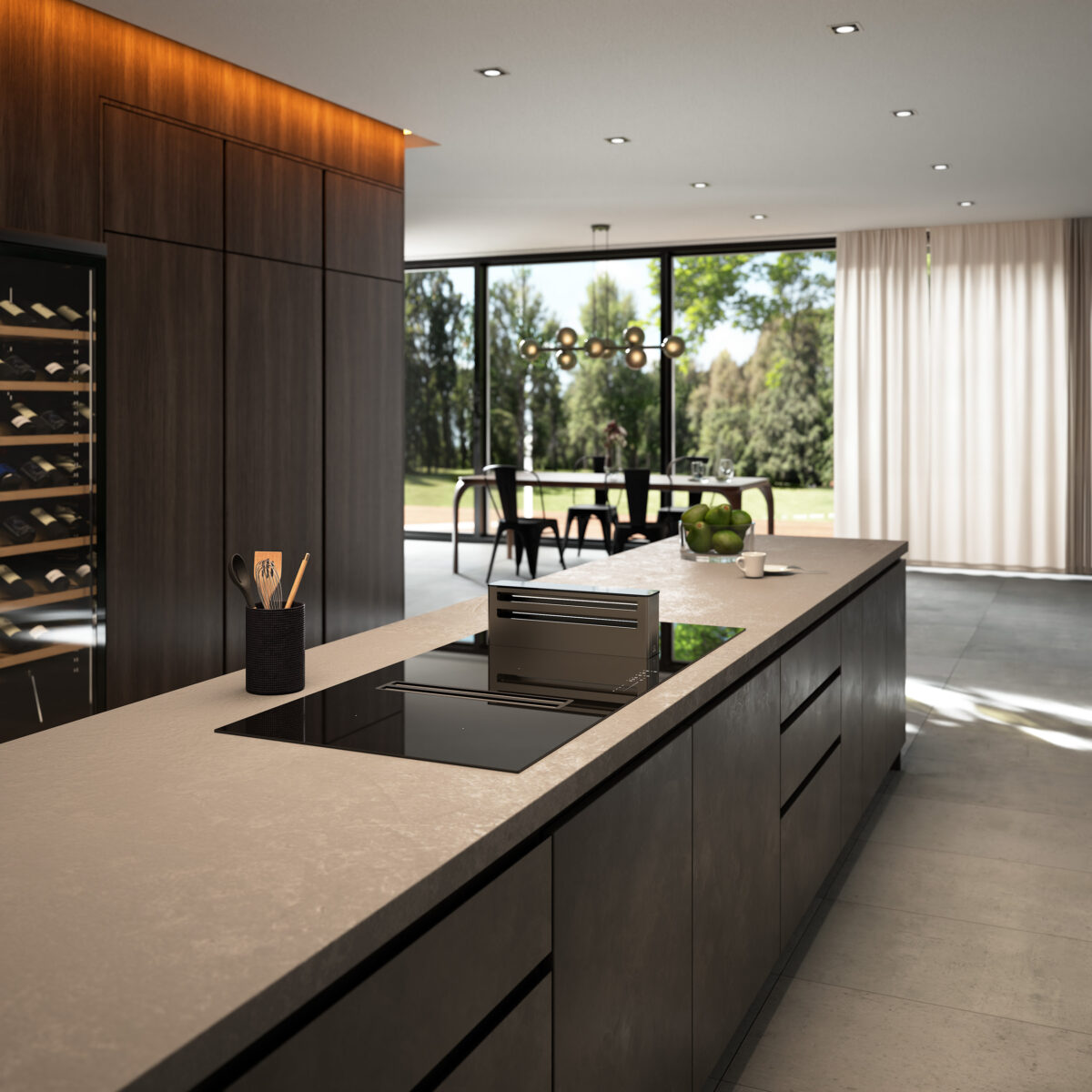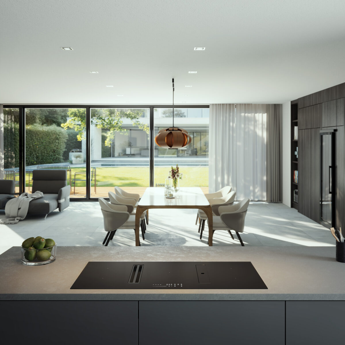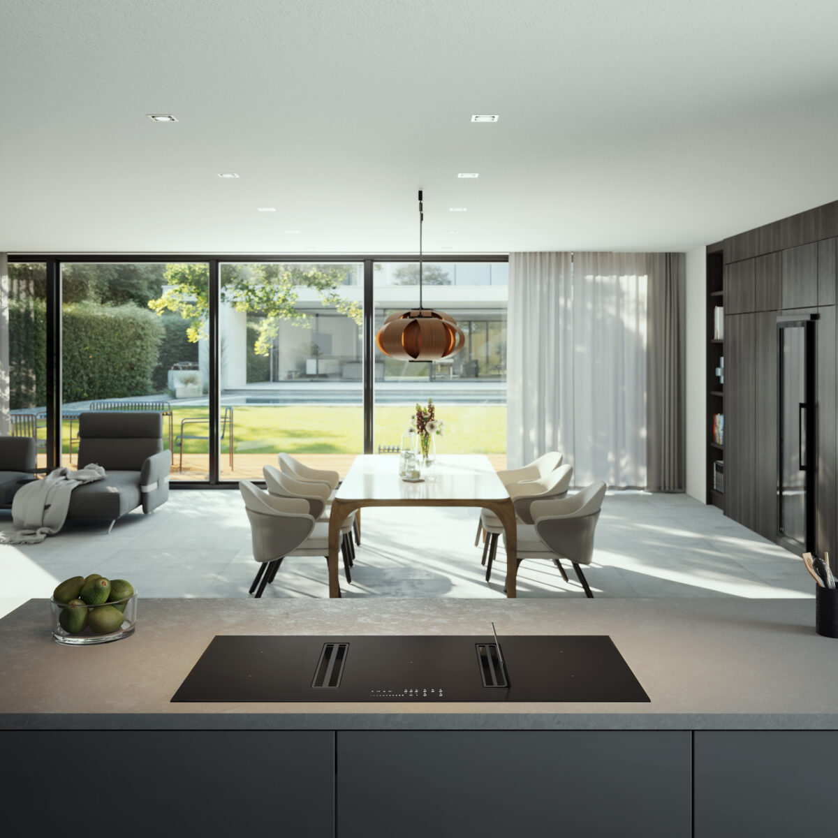TWINS 118 è il top della tecnologia nei piani aspiranti. Con 5 zone cottura, due bridge e un’ampia zona centrale su 118 cm, offre flessibilità unica. Doppia aspirazione, accessori come il Flap direzionabile e la Smart Tower per pentole alte, garantiscono aria sempre pulita.